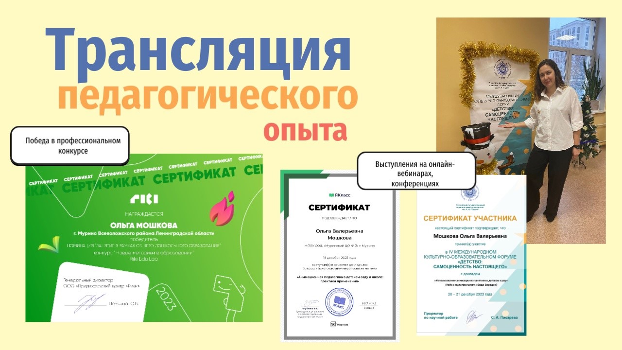 В данный момент я продолжаю работать воспитателем. Позади — победа во Всероссийском конкурсе профессионального мастерства «Новые методики в образовании» от ГК Riki (правообладатель брендов «Смешарики», «Фиксики», «Детектив Финник»), выступление в РГПУ им. А.И. Герцена на Международной конференции «Детство: самоценность настоящего». Впереди еще много чего интересного, но неизменно одно: ежедневная порция детского оптимизма и улыбок.